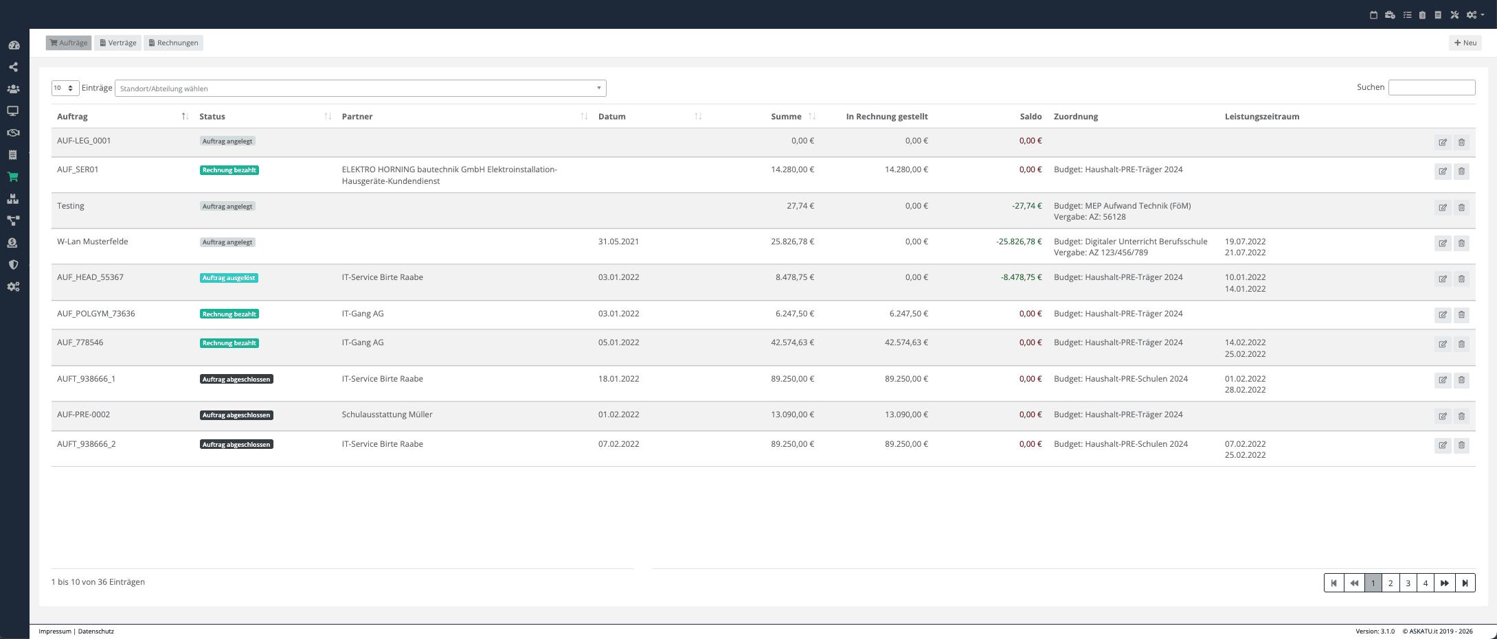 Der Modulbereich Aufträge bietet eine übersichtliche Darstellung mit direkter Verknüpfung zu Verträgen und Budgets sowie die klare Ausweisung aller offenen Salden und Vertragspartnern.