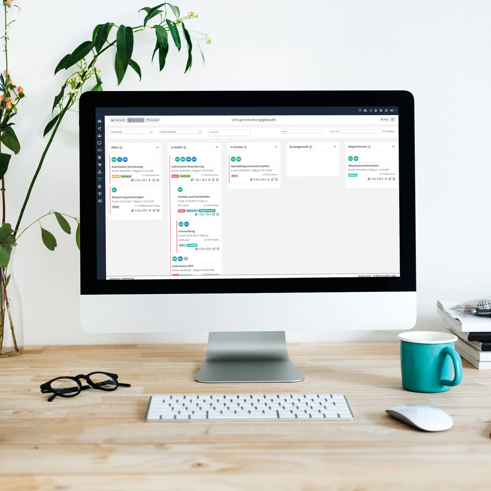 Das Projektmanagement-Modul unterstützt die Planung und Steuerung einmaliger, zeitlich begrenzter Vorhaben mit klar definierten Zielen und Meilensteinen. Aufgaben, Termine und Abhängigkeiten werden übersichtlich in Projektplänen, Taskboards und Kalenderansichten dargestellt. Verantwortlichkeiten können direkt Personen oder Teams zugeordnet und mit automatischen Benachrichtigungen ergänzt werden. So entsteht eine transparente Projektstruktur, die eine effiziente Zusammenarbeit und kontinuierliche Fortschrittskontrolle ermöglicht.